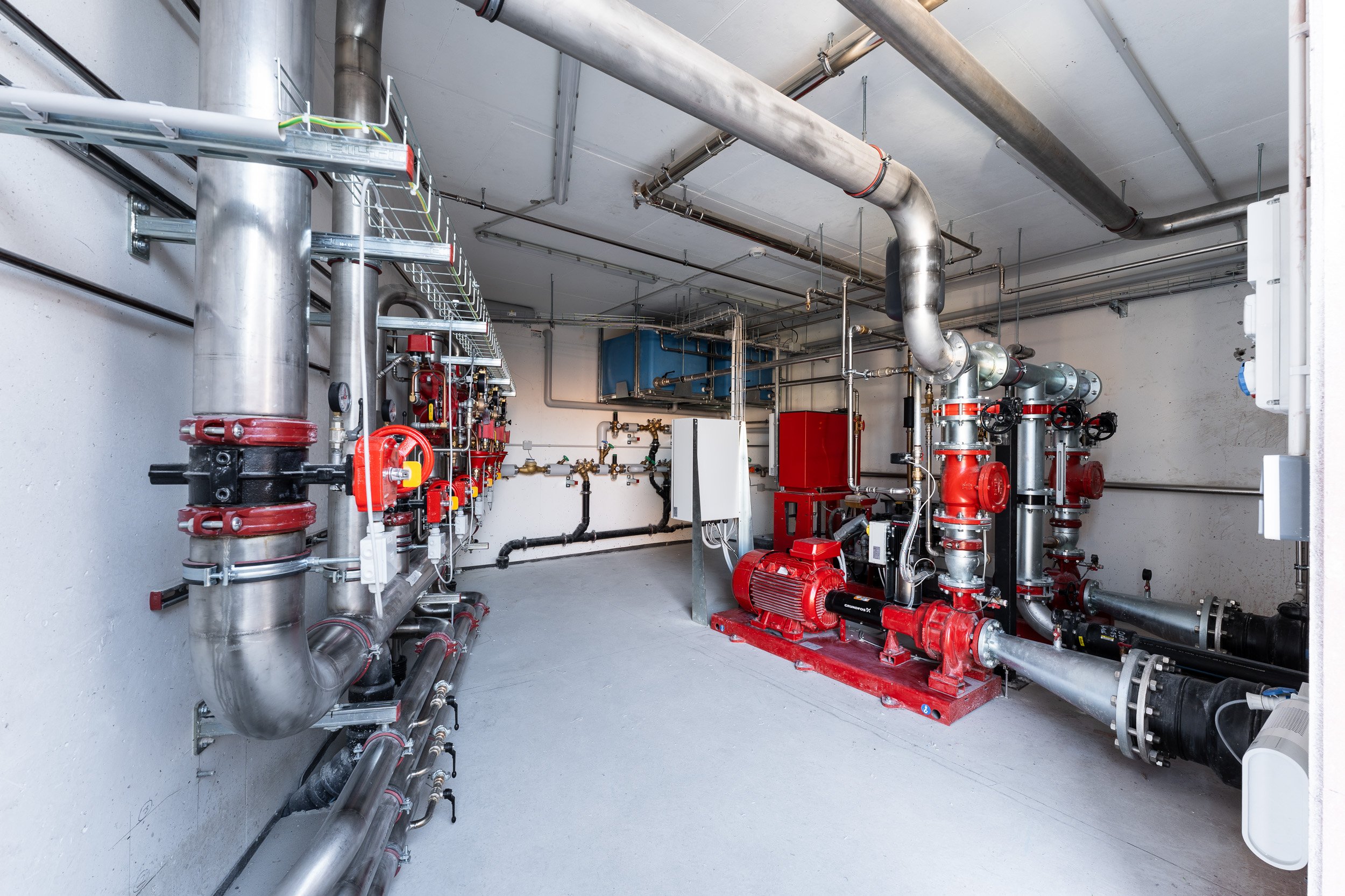 Die Ausführung umfasst die E-MSR-Anlage sowie die Installation der Sprinkler-, Heizungs-, Sanitär- und Lüftungsanlagen.